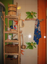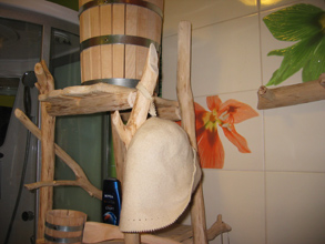 в данном случае интерьер помещения с душевой кабинкой, одновременно являющегося раздевалкой и входом в парную